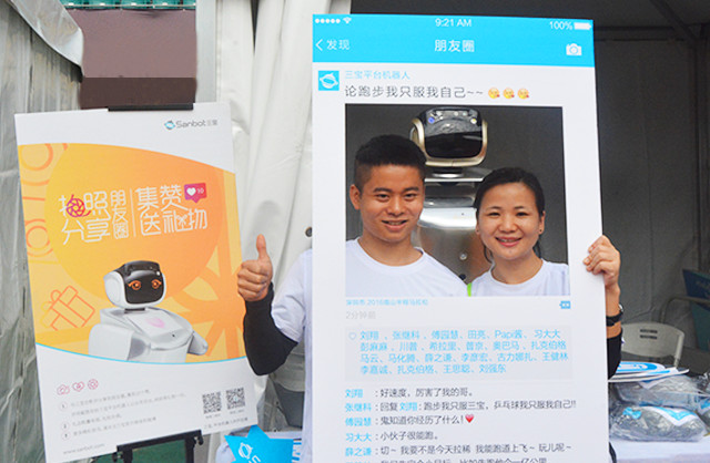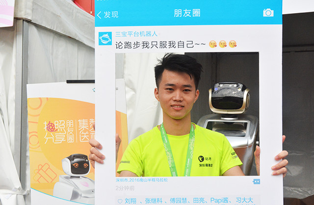 比赛当天,刚参加完马拉松比赛的小宝拉着女友来到三宝平台机器人的展位,就被三宝这类人形的外形所吸引,两人开始与机器人拍照互动。正当女友与工作人员交流之时,三宝平台机器人却加入了小宝精心策划的求婚当中。在小宝拿出提前准备好的鲜花戒指对女友浪漫表白时,三宝全程高能助攻,伴随播放的marryyou翩翩起舞,一曲唱完更是高声循环"嫁给他嫁给他",科技前卫的浪漫氛围,引发了在场众人集体围观,三宝也被冠名为高科技求婚神器。